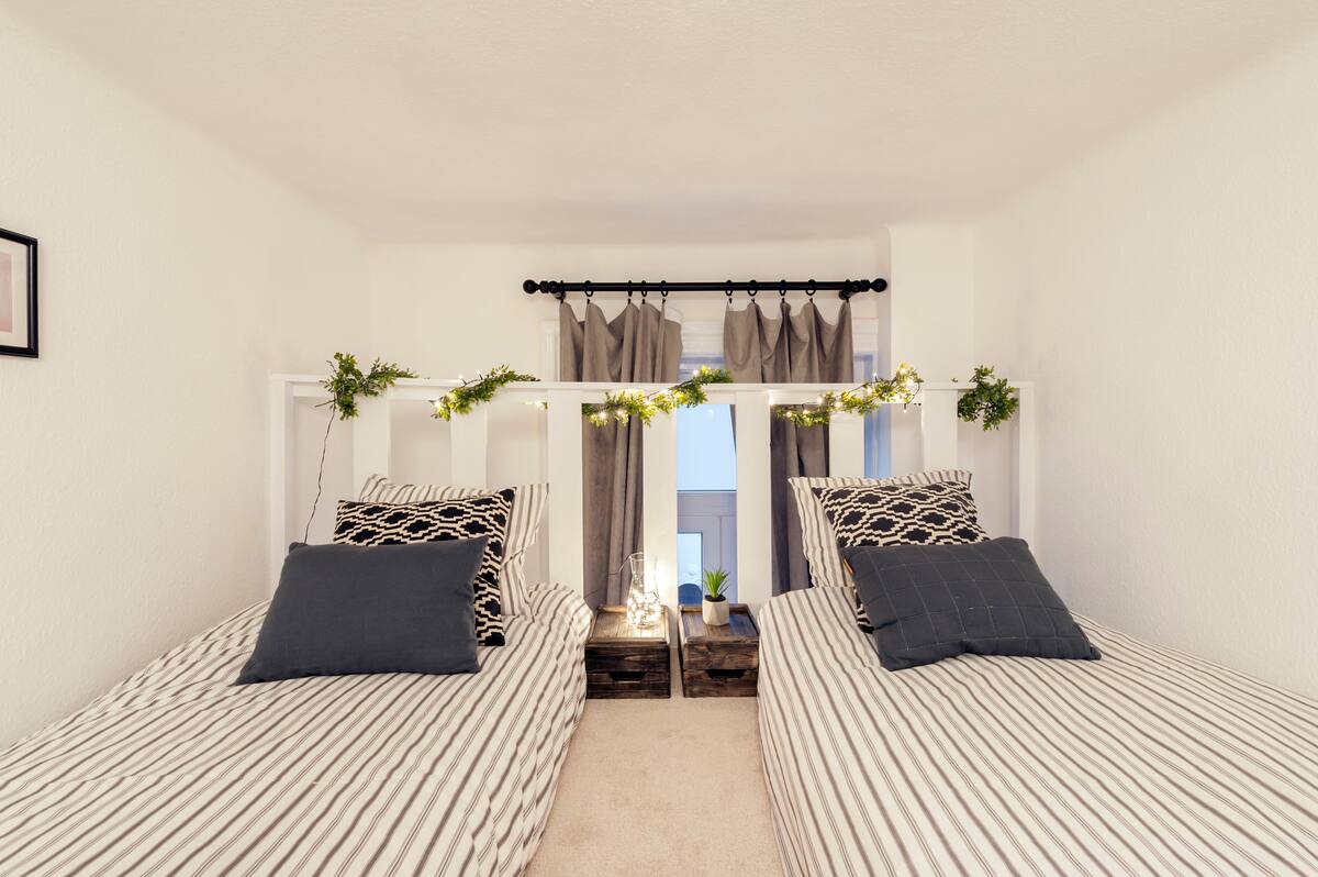 We have a Queen sized bed for guests and also two single sized comfy mattresses in our Enchanted Treehouse aka our loft. They are full sized mattresses, so adults and children will both love our magical loft. There is also a sofa bed that can fit two more in the living room.