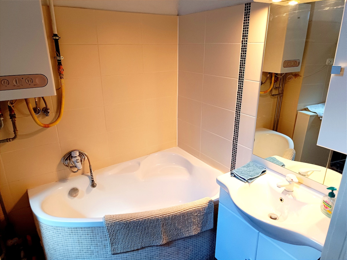 The flat consists of a bedroom, living room with Android TV, kitchen and dining area, a full bath with shower stall and bathtub. The toilet is separate and there is a small room ideal for work.