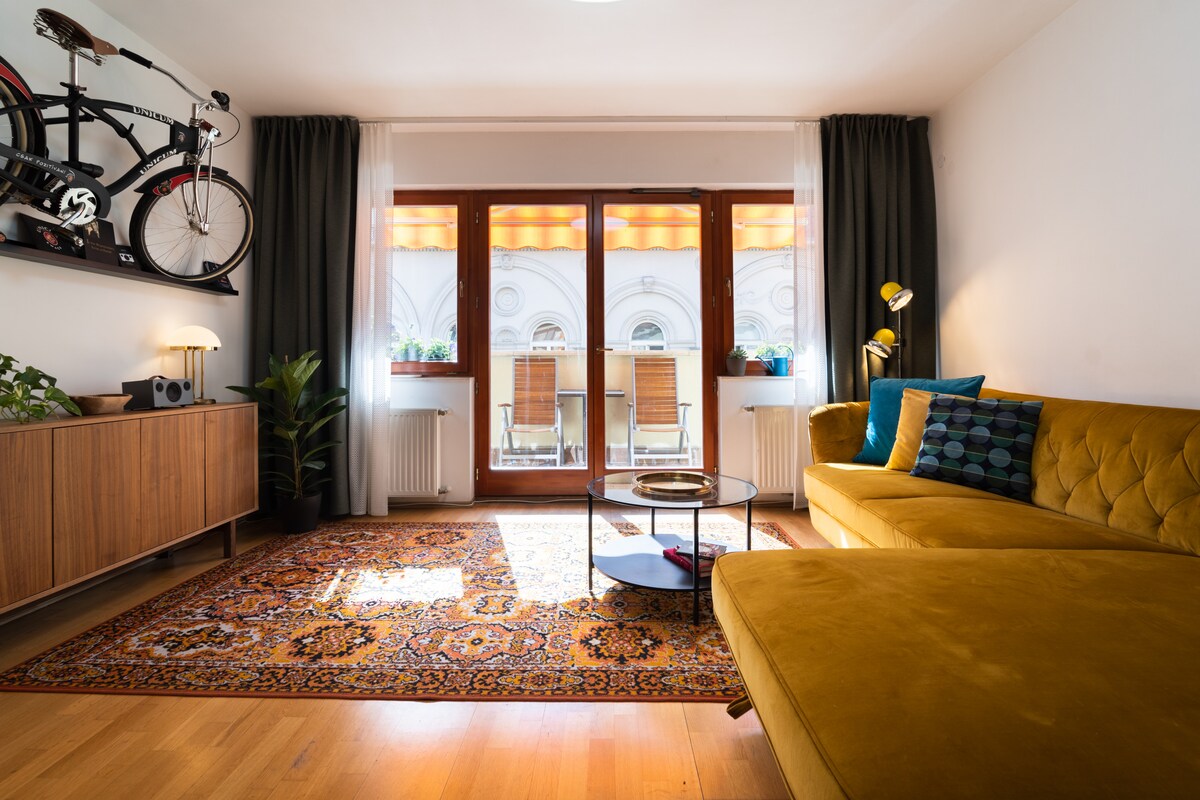 Whip up a fabulous brunch in a rich cherry-wood kitchen, then enjoy it on a terrace overlooking rooftops. After a night out on the town, a soothing living room with spacious gold velvet couch an patterned rug is the perfect way to chill.