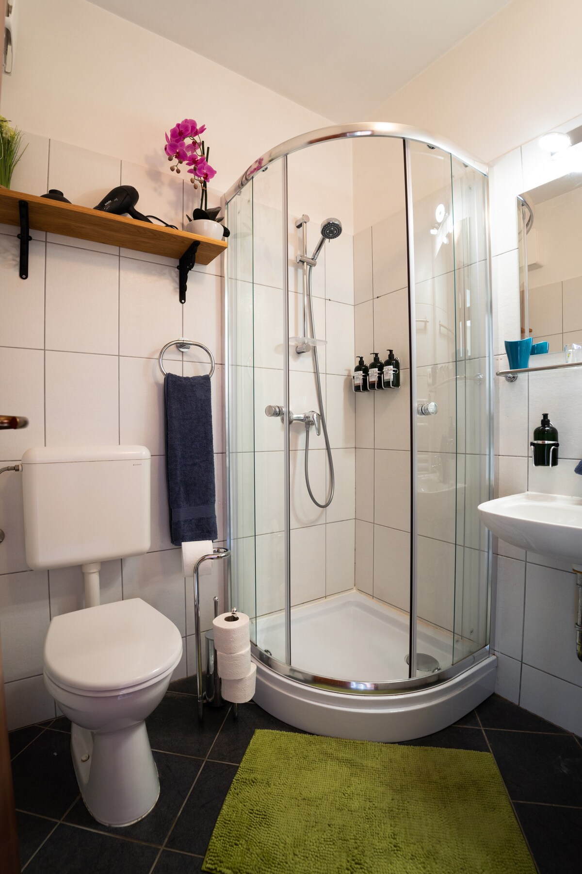 Bathroom on first floor has a shower and is equipped with a hairdryer.